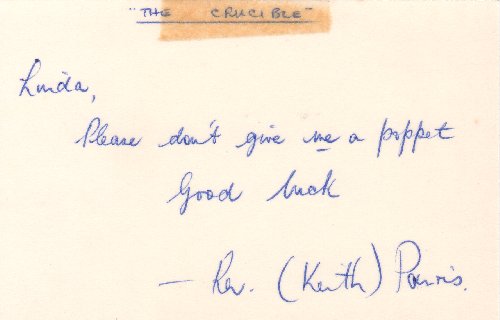 Keith Dobinson tried to characterize Parris, but for me he made the mistake of making him so patently evil right from the start that I doubt if Hale or the Judges would have believed the trials all that necessary. I think this character needed sharper delineation in the first act particularly, showing a more genuine sense of misguided fear and zeal, a selfish, foolish man but not wholly evil. But even within Keith's conception of the role, I found the playing superficial.