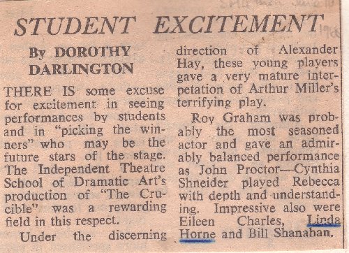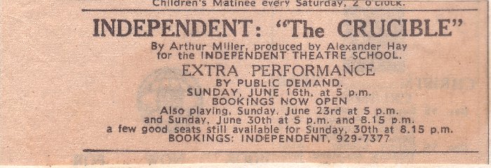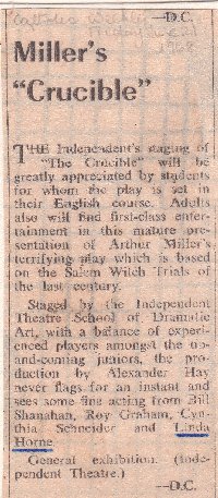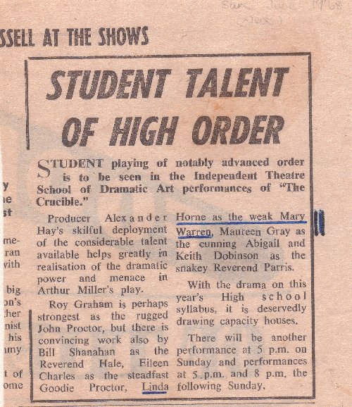 Staged by the Independent Theatre School of Dramatic Art, with a balance of experienced players amongst the up-and-coming juniors, the production of Alexander Hay never flags for an instant and sees some fine acting from Bill Shanahan, Roy Graham, Cynthia Schneider and Linda Horne.