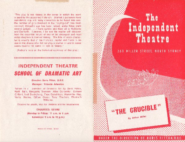 Student playing of notably high order is to be seen in the Independent Theatre School of Dramatic Art performances of "The Crucible". Producer Alexander Hay's skilful deployment of the considerable talent available helps greatly in realisation of the dramatic power and menace in Arthur Miller's play. Roy Graham is perhaps strongest as the rugged John Proctor, but there is convincing work also by Bill Shanahan as the Reverend Hale, Eileen Charles as the steadfast Goodie Proctor, Linda Horne as weak Mary Warren, Maureen Gray as the cunning Abigail and Keith Dobinson as the snakey Reverend Parris.